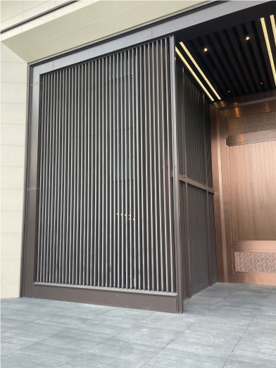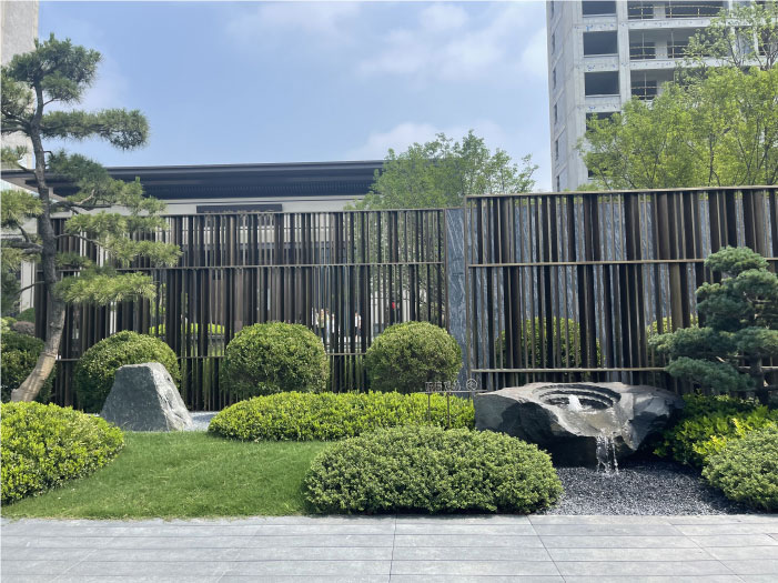 大門整體設(shè)計融合了現(xiàn)代與傳統(tǒng)元素,古銅色的不銹鋼與云紋裝飾性金屬扣相呼應(yīng),現(xiàn)代的不銹鋼材料與古典的設(shè)計花紋相互碰撞,彰顯出高貴典雅的氣質(zhì)。