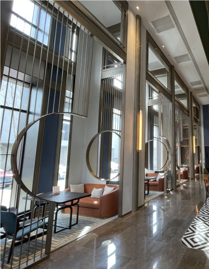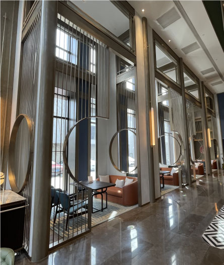 大廳圓形鏤空不銹鋼屏風(fēng)打造出一個(gè)個(gè)相互聯(lián)系卻又相對(duì)獨(dú)立的空間